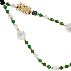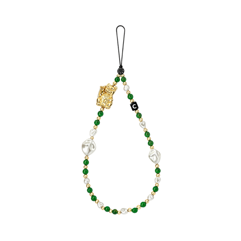 El Casetify Strap de Mano Lucky Cat Green combina elegancia y simbolismo en un accesorio único para tu teléfono. Su diseño con cuentas en tonos verde, perla y dorado, junto al icónico Lucky Cat, representa prosperidad, buena suerte y estilo.