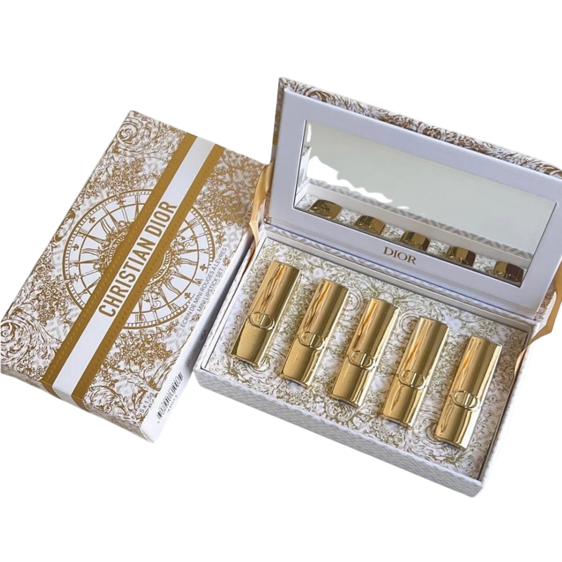 Christian Dior Mini Lipstick Set – Edición Especial Dorada (5 piezas + estuche espejo)