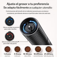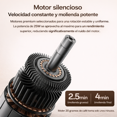 Su sistema de molienda cerámica de alta precisión y motor silencioso garantizan resultados uniformes con mínimo ruido, mientras que el ajuste de grosor te permite preparar espresso, moka, drip coffee, prensa francesa o cold brew con facilidad.