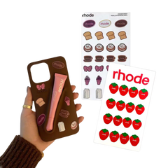 Decora tu mundo con dulzura con este adorable set de stickers inspirado en la estética de Rhode. Incluye dos hojas llenas de diseños divertidos y deliciosos como fresas, tostadas, moños, malteadas, rollos de canela, tazas de chocolate y más, todo con el toque icónico de la marca.